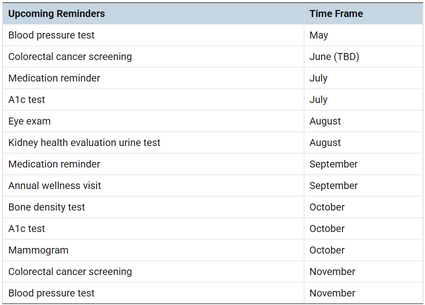We’re conducting targeted outreaches to our plan members throughout the year to stress the importance of certain activities, including getting needed health screenings and tests. We’ve developed postcards and emails to deliver reminder messaging to those due for the following activities. As a companion to these efforts to close gaps in care, we’ve also designed a personalized health profile of the activities a member may be due for, presented in an easy-to-read chart format. Members who are eligible and noncompliant for at least one of 11 measures will be sent a health profile via mail in May. Your patients may talk with you about the communications we send or ask questions about these topics. Please encourage them to complete the activities.